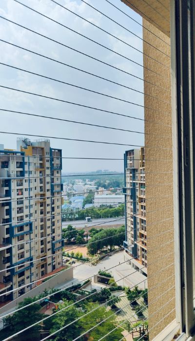 Secure your space with Aparna Pigeon Safety Nets and stylish cloth hangers. Contact us for installation!
